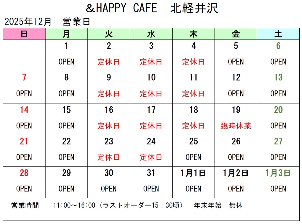 - 2025.11.30 年末年始12月26日(金)~1月4日(日)営業致します。 営業時間 11;00~16;00